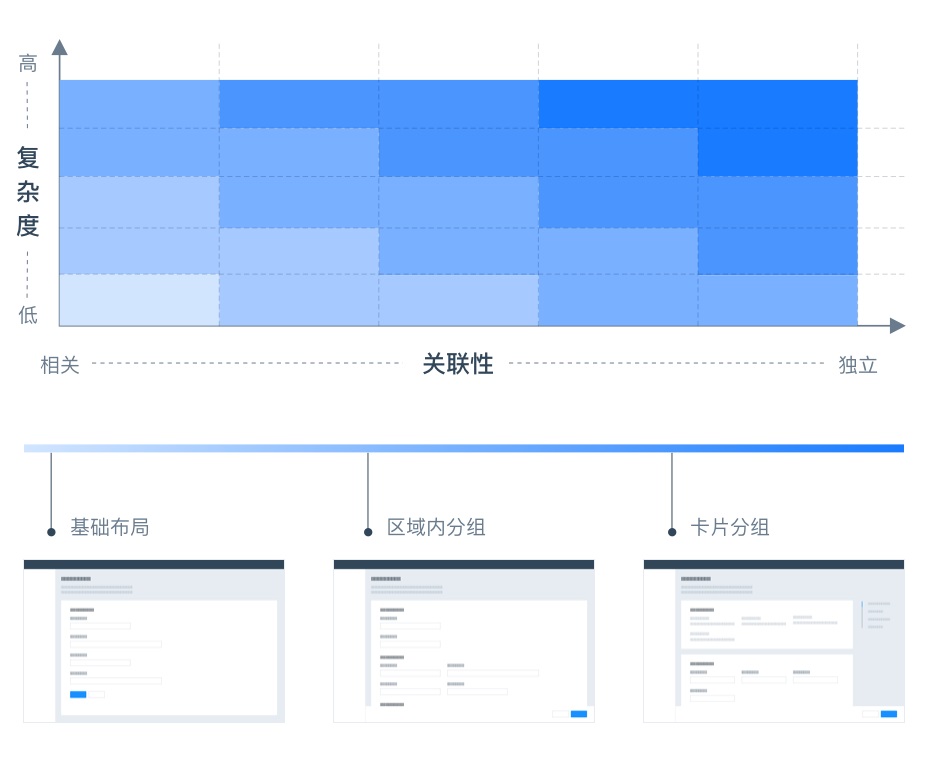 分析了解表單的結(jié)構(gòu)關(guān)系,判斷表單,尋找共性的內(nèi)容,將他們封裝為一個卡片,也可以封裝成一個組。主要的目的就是減少用戶認知負擔,提升操作/使用效率。
