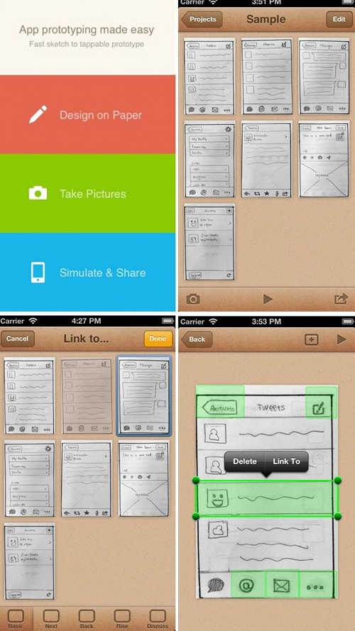 操作輕巧簡單:先用手機拍下草圖原型(存到POP app內(nèi));然后開始編輯圖片的哪個區(qū)域(按鈕)鏈接到什么頁面,添加跳轉(zhuǎn)鏈接熱區(qū),就可以在iPhone上給小伙伴們演示了,并且POP內(nèi)嵌的交互動作 如側(cè)滑、展開、消失等,即可滿足一般的動態(tài)演示需要。不太明白?
