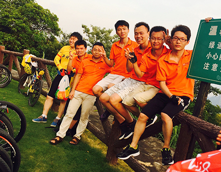 在這35度高溫的烈日下,行走已是不易,何況幾個(gè)小時(shí)的騎行,對(duì)于大部分平時(shí)都是坐辦公桌面前不怎么運(yùn)動(dòng)的員工而言,這也是一種鍛煉了。終于堅(jiān)持騎到山腳下,我們的楊博士和“小鮮肉”陳同學(xué)早已承受不住這個(gè)強(qiáng)度的鍛煉,最后離山腳下的中轉(zhuǎn)休息站之間的小長(zhǎng)坡都已經(jīng)放棄。雖然小編我也遭不住這個(gè)鍛煉,心里想著既然都要到山腳了就最后再拼一下吧!還是要看看這個(gè)山腳到底長(zhǎng)啥樣吧!