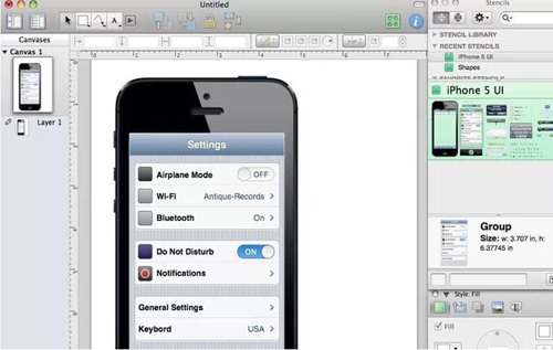 它采用拖放的所見即所得界面,你可以用鋼筆工具繪制自定義的模版或者圖形,此外還自帶Graffletopia提供的多個iPhone、iPad以及Android模版。