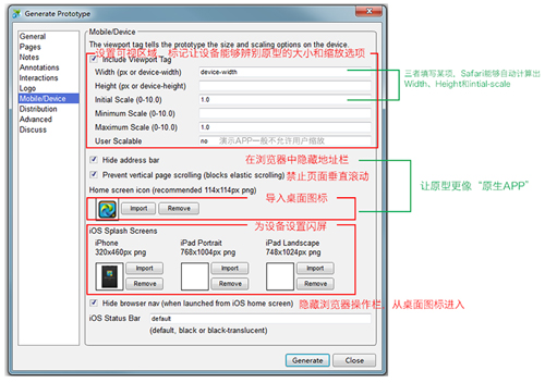 大家都很熟悉了,這里主要說下移動端的演示,這樣才充分表達原型意圖。按F5生成原型的時候,在“Mobile/Device”選項中可以設(shè)置適配移動設(shè)備 的特殊原型(Axure 6.5以下版本),再用移動設(shè)備訪問你生成的原型鏈接即可(該頁面創(chuàng)建一個桌面快捷方式)。